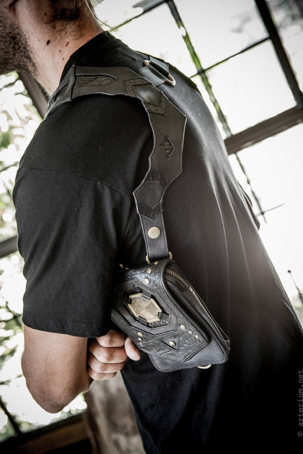 Be bold in this bad ass design... The labyrinth of life.. custom brass hardware .. spunky, strong leather.. Black and brass men's leather holster, pockets can easily hold all your essentials.. zippered pockets w a perfect fit to carry all perfect for partying or travelling .. keep all your essentials safe and do it in style! ;) Pockets fit iphone, camera, passport etc :)