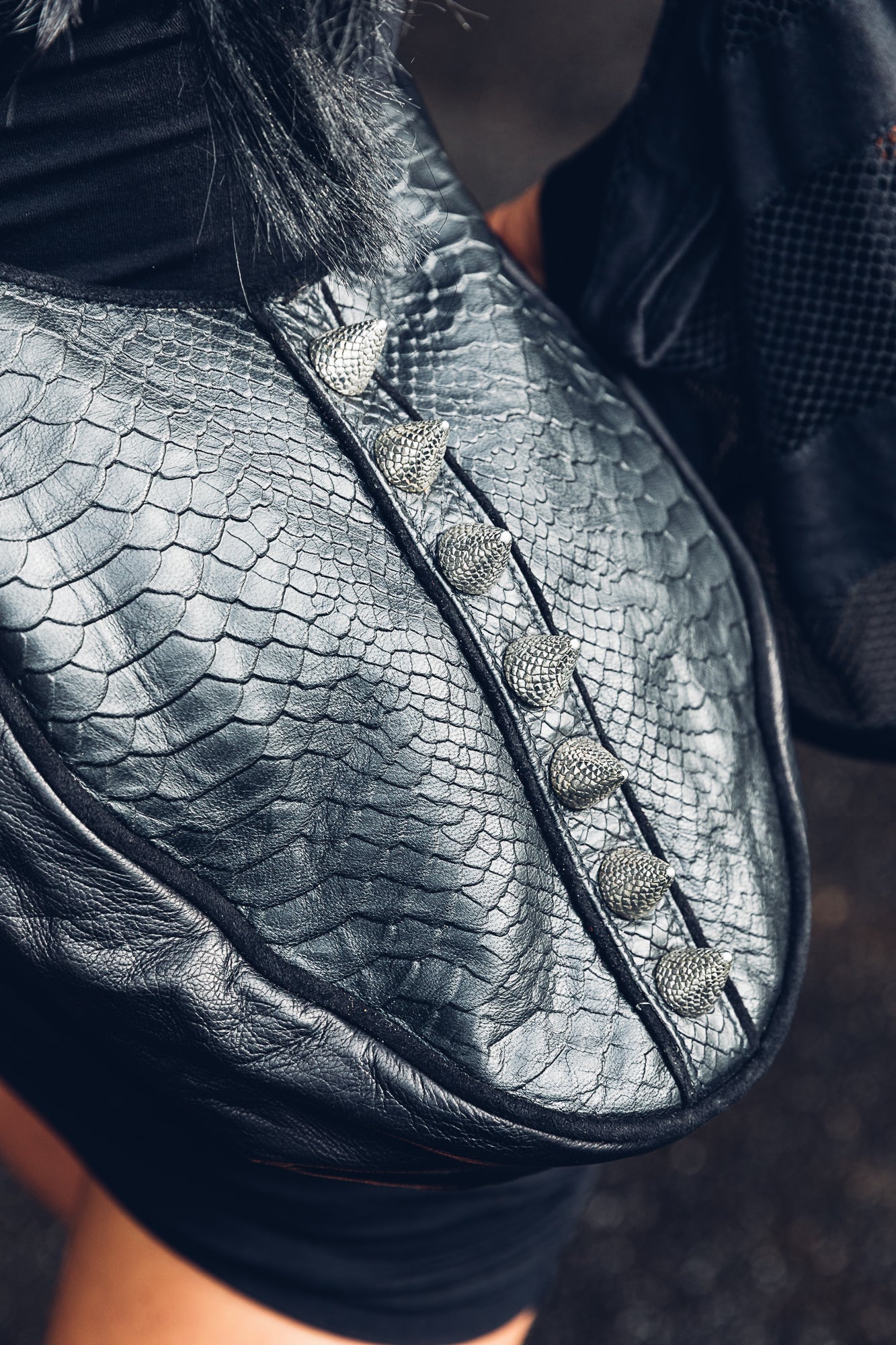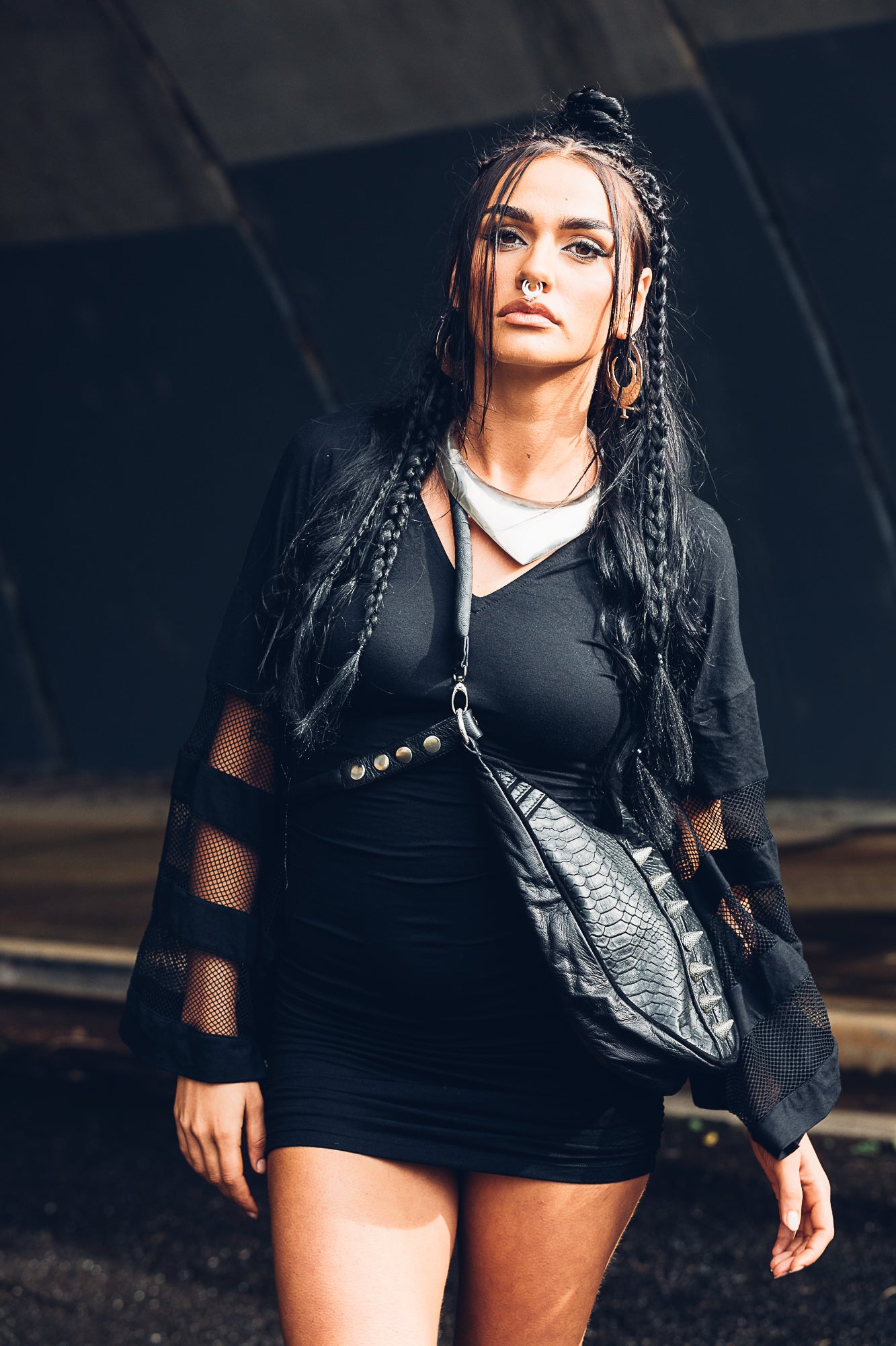 Part of our new " Moon Drops' Collection this is one of 3 different styled leather bags for women , this one is part dominatrix and 100 % baddie material. Flex heads in this gorgeous and practical bag. It can be worn as a handbag or as a cross body bag ( msg me for your waist size ( all custom made ) The studs are one off custom serpentine, snake studded snake studs for that extra bang. The bag is made from genuine leather with snake print, features suede detailing and has silver ykk zips with inside and outside pockets.