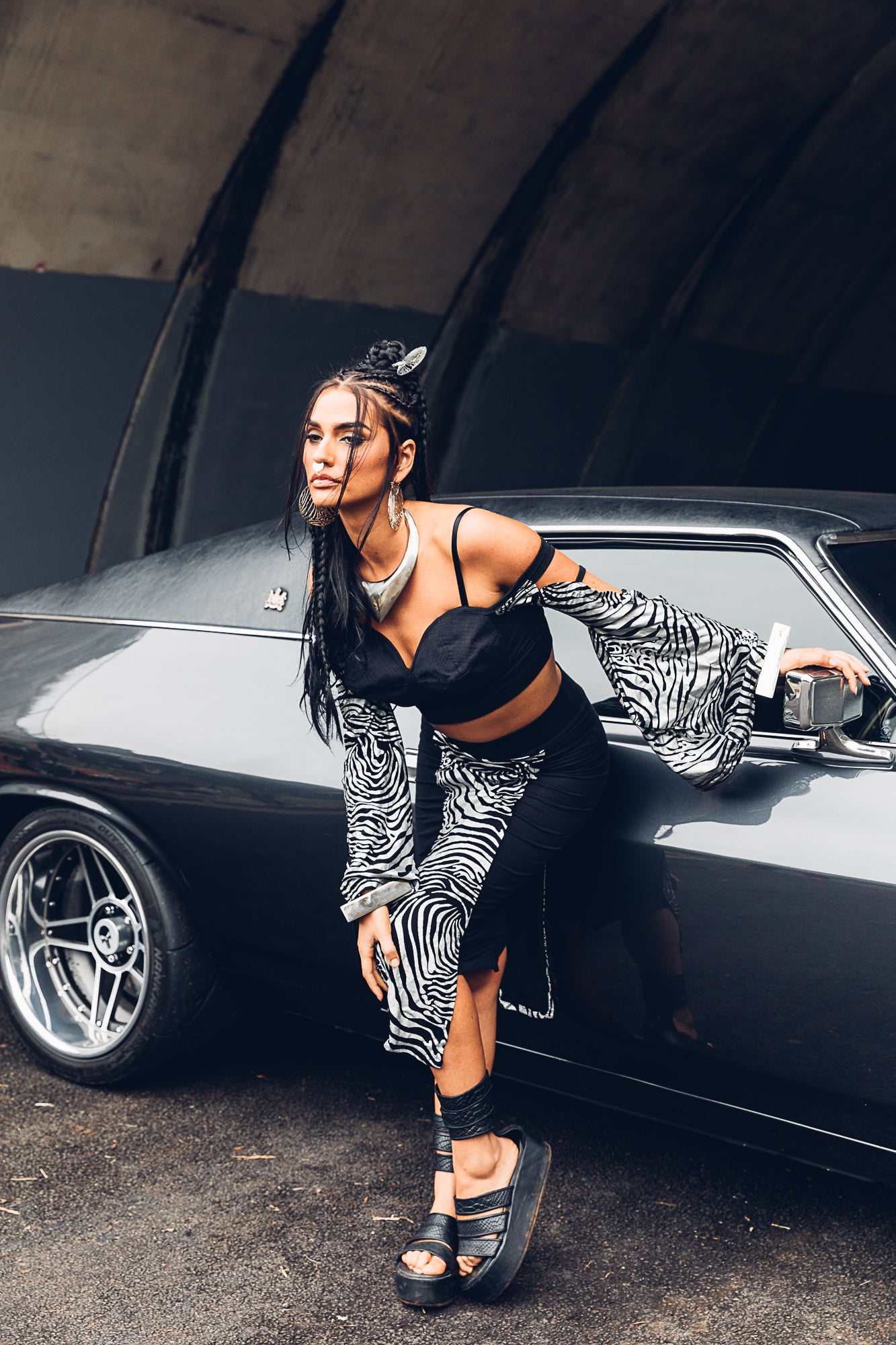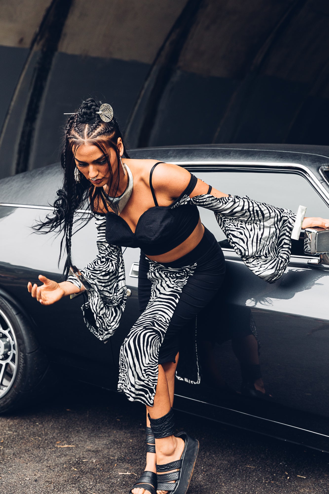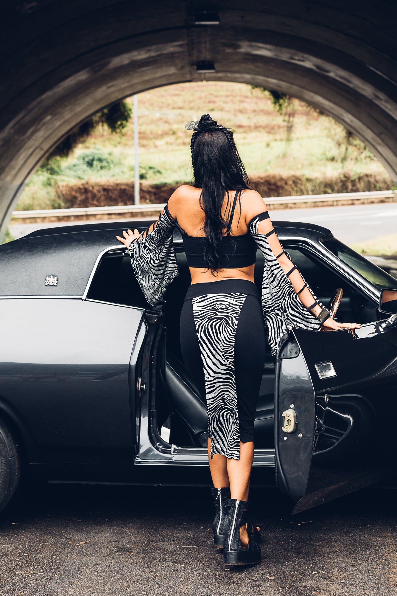 Funky fusion, statement top, combining my love of asian design and 60's flair. It has the classic bullet bra made from organic cotton and silver hand printed zebra print , bamboo sleeves. This top will add bang to any bottoms but pairs perfectly with my new Adira skirt also made from organic cotton pictured above.
