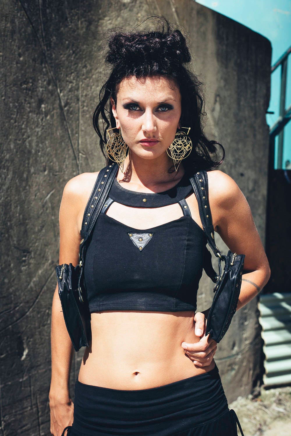 My newest and most favourite holster yet. Designed as a ladies holster but can we worn unisex. This one has more practical pockets than my past holsters with the usual strong ykk zippers and an inside zippered pocket teamed with a inside divider to seperate your goodies. Big enough to fit all your essentials without being too bulky. It has two strong snap button settings to wear it lower or higher under your arms. Gorgeous hexagon diamond shape with layered leather and brass studs. Designed as all my items to compliment any item in your wardrobe and any Serpentine piece. Elegant yet dark and edgy your new favourite x
