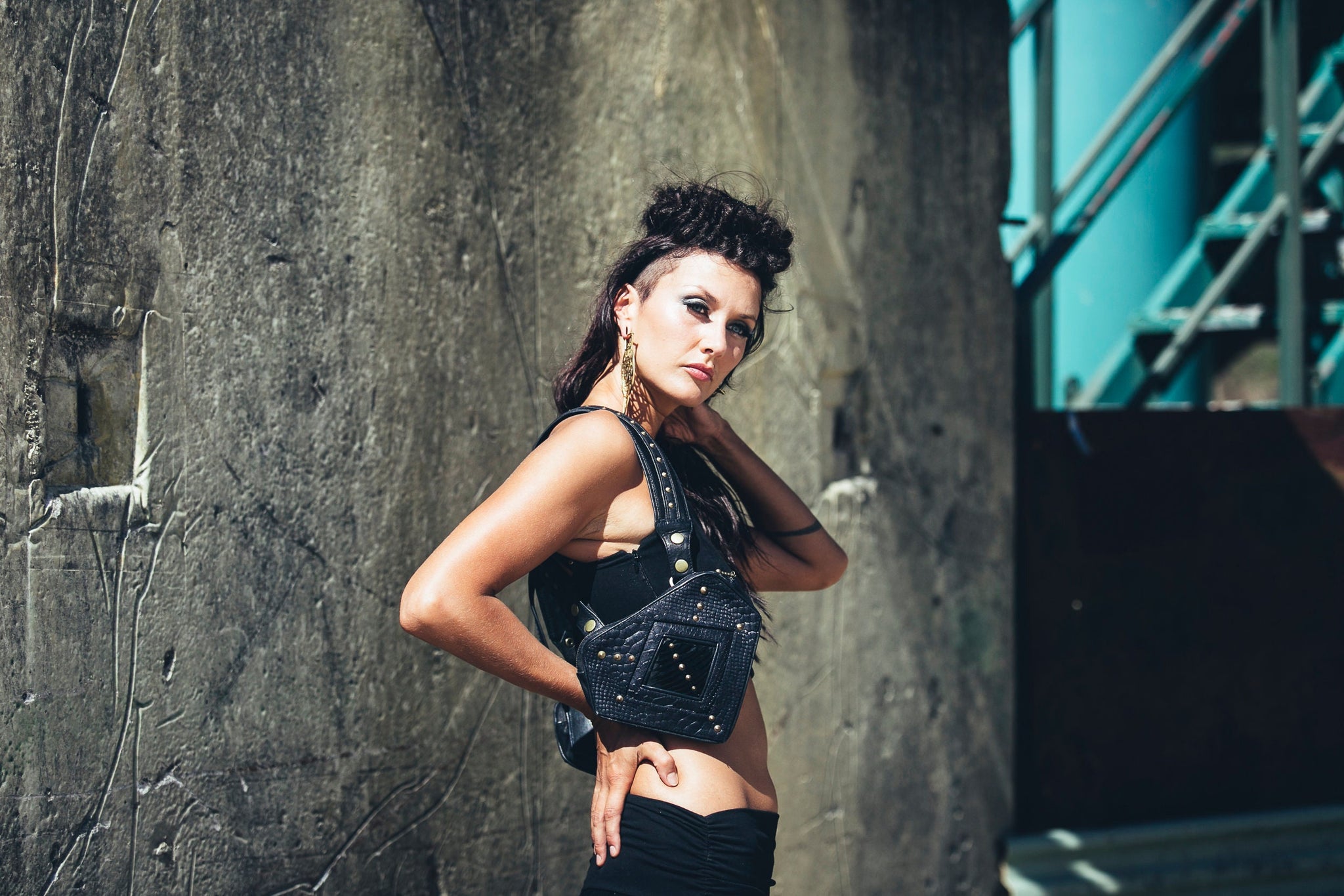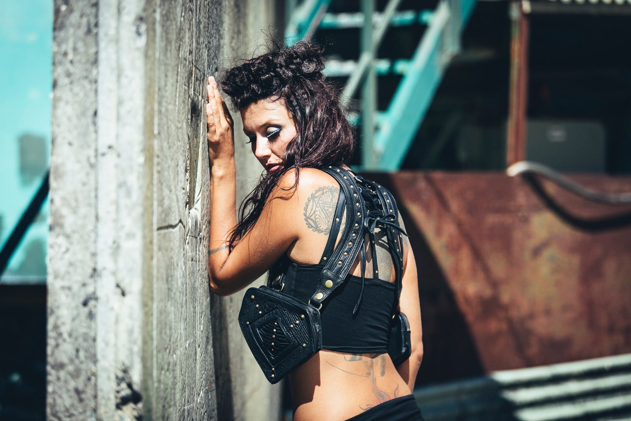 My newest and most favourite holster yet. Designed as a ladies holster but can we worn unisex. This one has more practical pockets than my past holsters with the usual strong ykk zippers and an inside zippered pocket teamed with a inside divider to separate your goodies. Big enough to fit all your essentials without being too bulky. It has two strong snap button settings to wear it lower or higher under your arms. Gorgeous hexagon diamond shape with layered leather and brass studs. The bags are detachable so can be worn as a single holster or even used as a clutch. Designed as all my items to compliment any item in your wardrobe and any Serpentine piece. Elegant yet dark and edgy your new favourite x